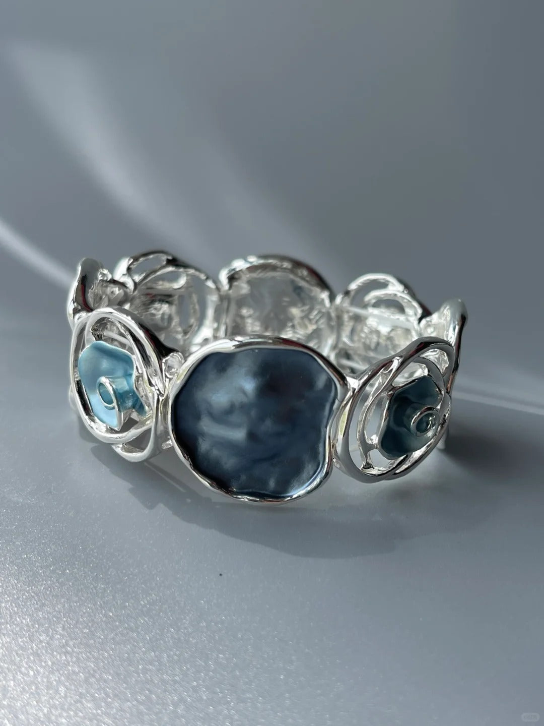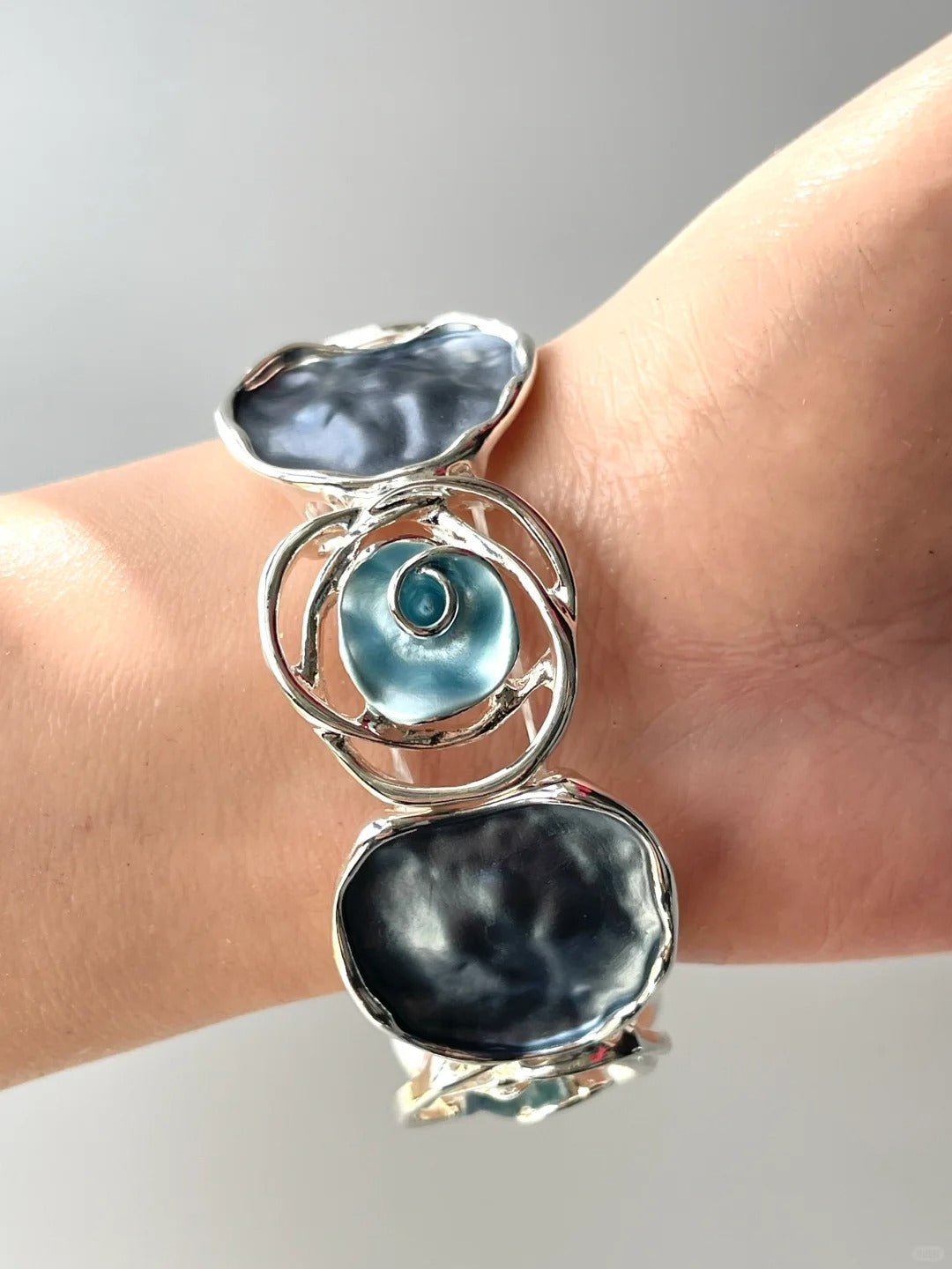 Make a vibrant statement with this blue enamel circle bracelet. Featuring bold, exaggerated circles and vivid colors, it’s perfect for layering, casual or festive outfits, adding a playful and eye-catching accent to any look.