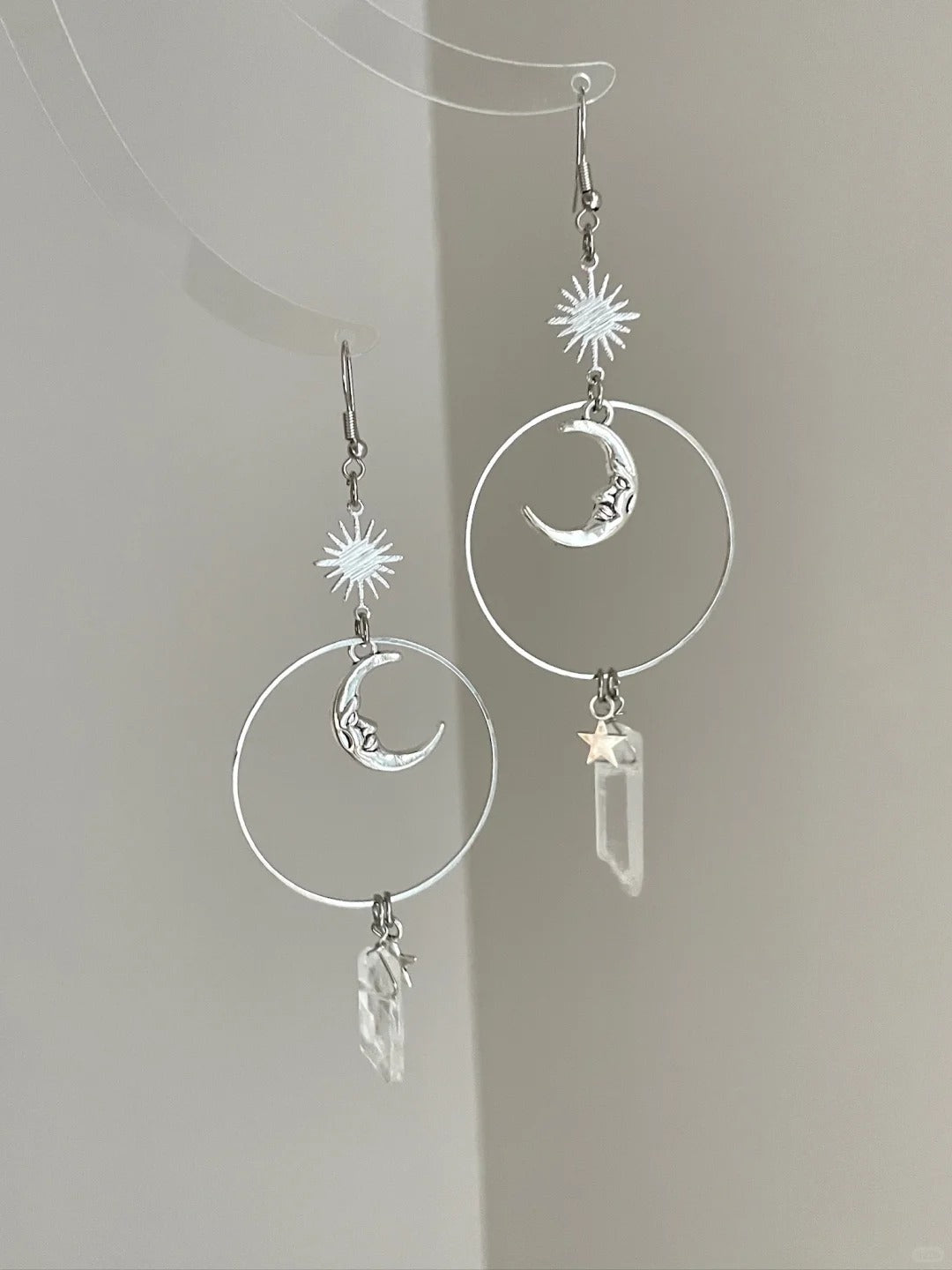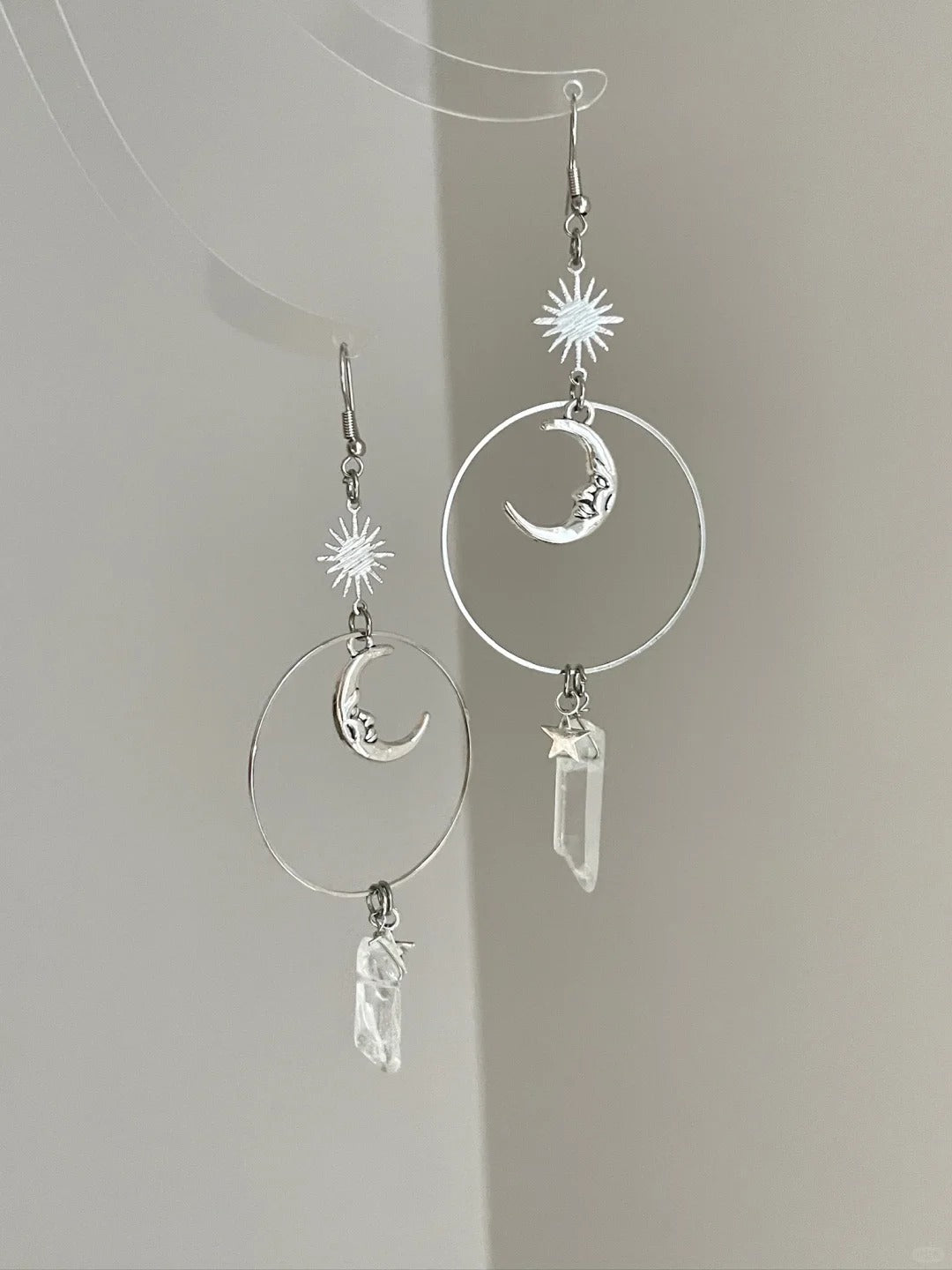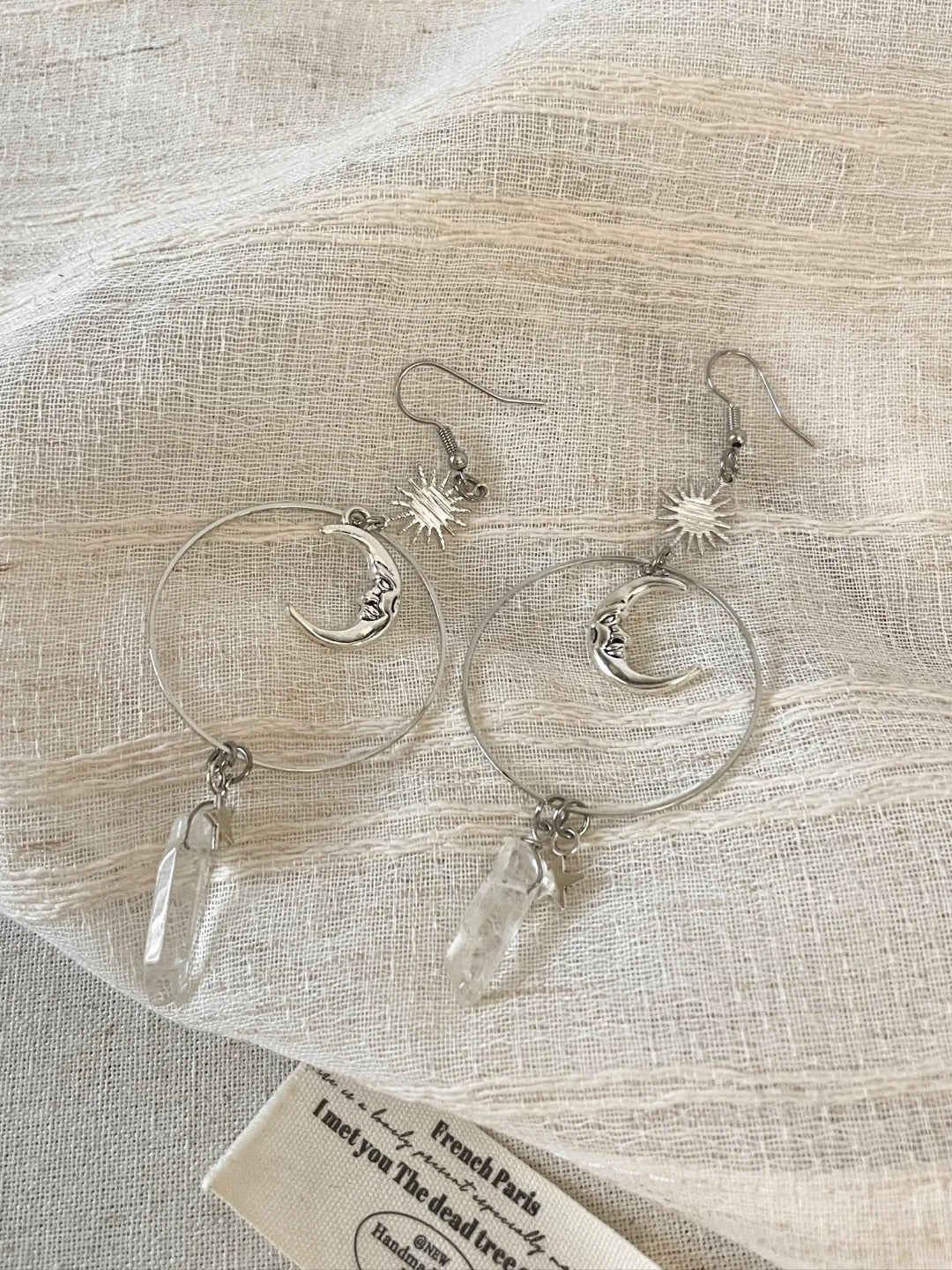 Add a celestial and elegant touch to your style with these handmade Celestial Night earrings. Each earring features delicate stars and moon motifs and a white crystal pendant at the bottom, symbolizing the harmony of the night sky. Perfect for layering, special occasions, or enhancing everyday outfits, these earrings combine artisanal craftsmanship with timeless elegance and unique design.