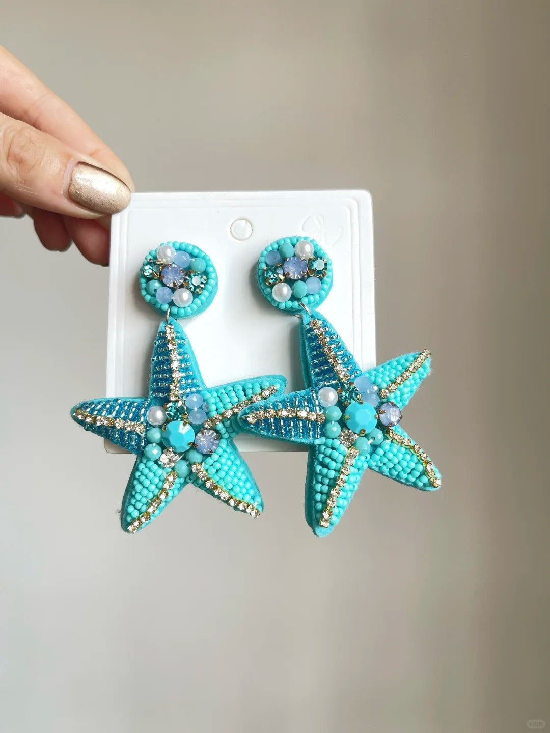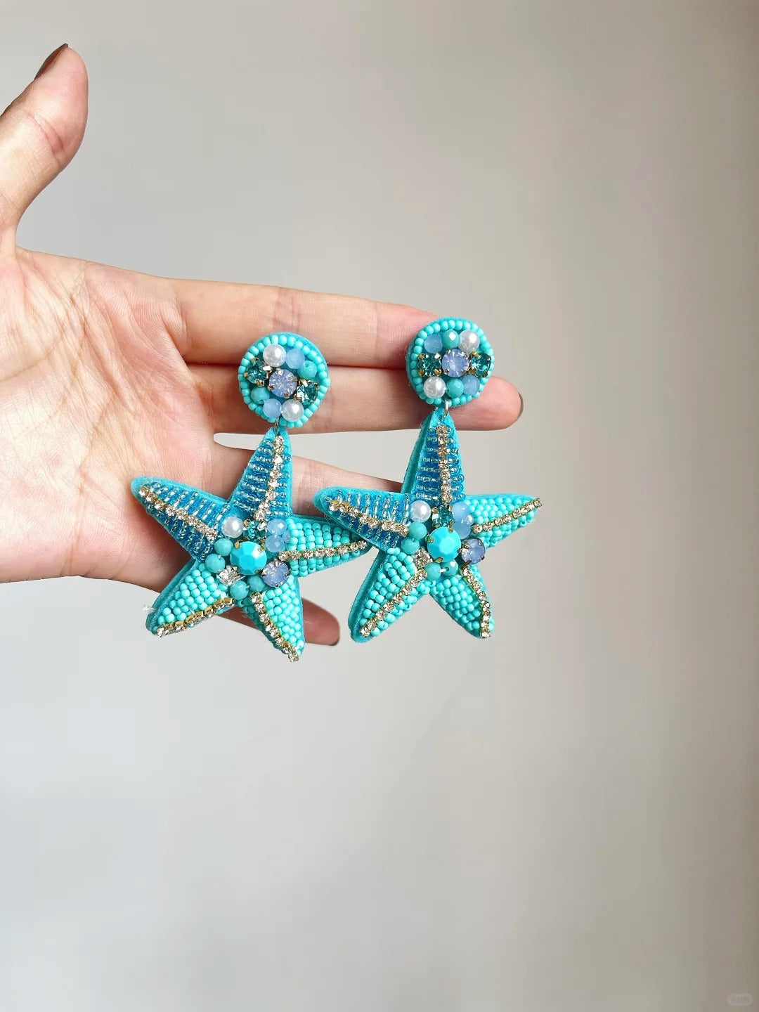 • Handmade beaded earrings with bold blue starfish design