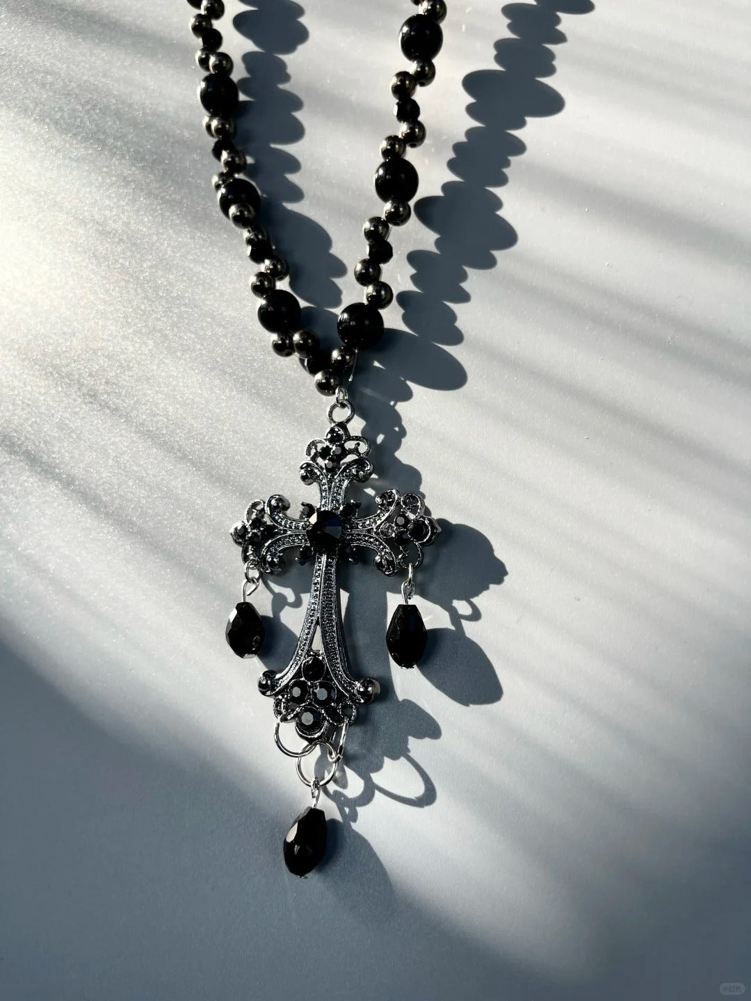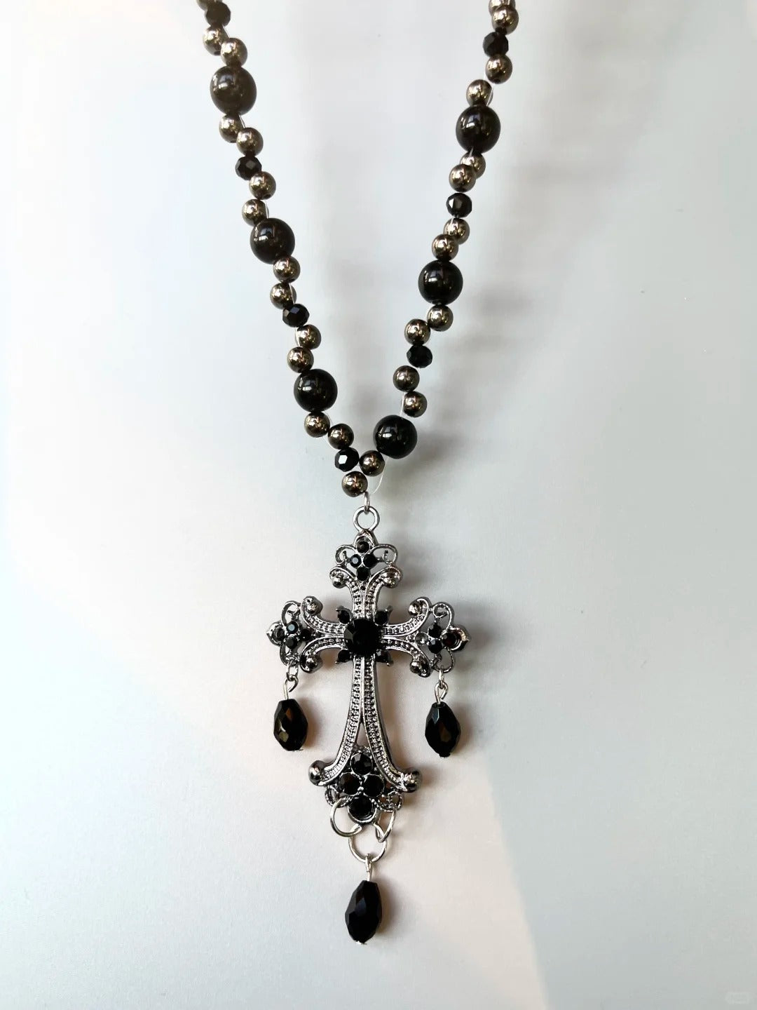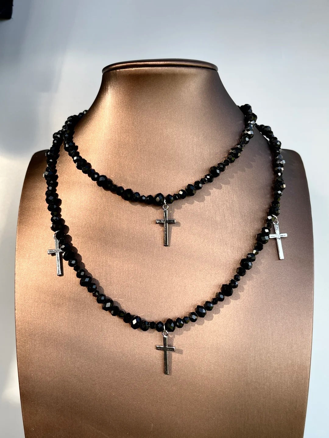 • Black multi-layer design with prominent cross pendant