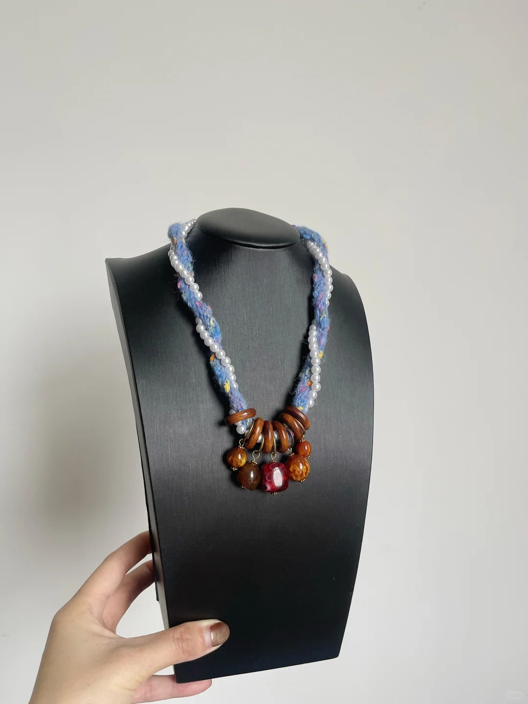 • Handcrafted fashion jewelry with blue and brown beads