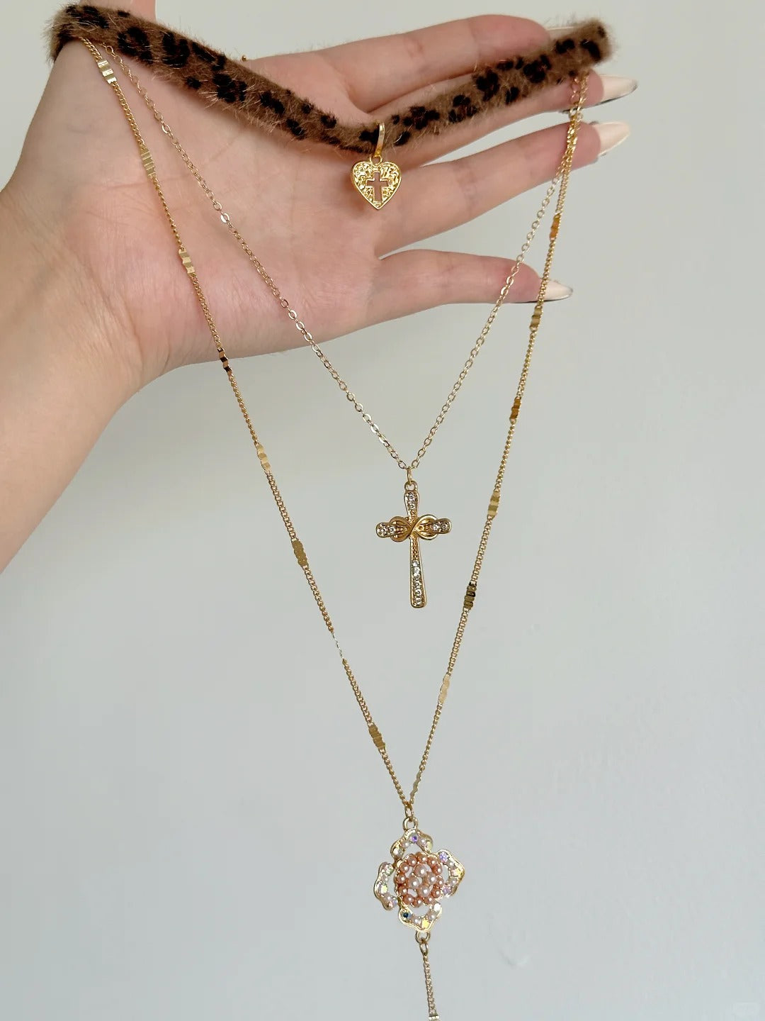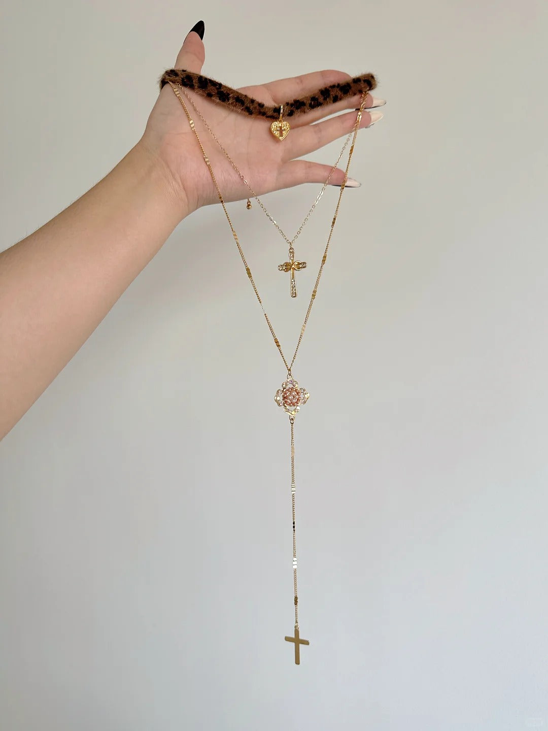 Includes three necklaces: leopard choker, chain link, and cross pendant