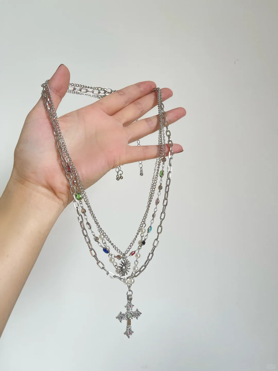 Elevate your style with this Sunflower Cross Multi-Layer Necklace Set, blending silver tones, crystal sparkle, and bold layering. Each set includes four separate necklaces — a mix of sunflower, cross, and crystal details that create a cool, stylish statement when worn together or separately. Perfect for streetwear, parties, or everyday layering, this set adds instant edge and brilliance to any outfit.