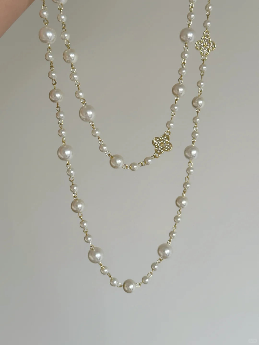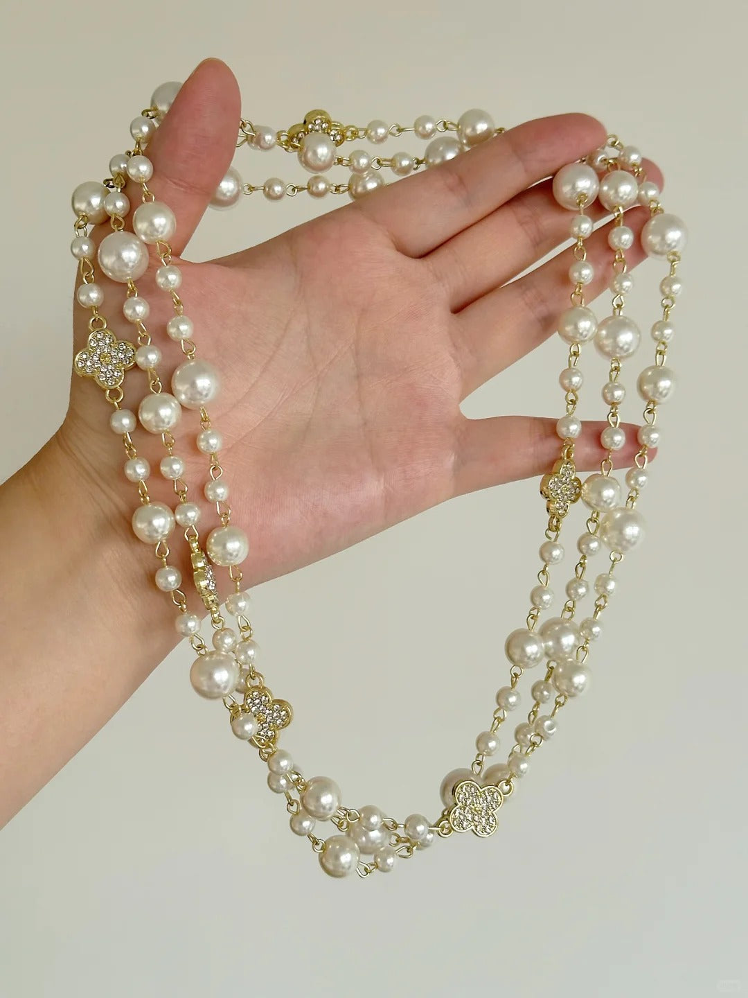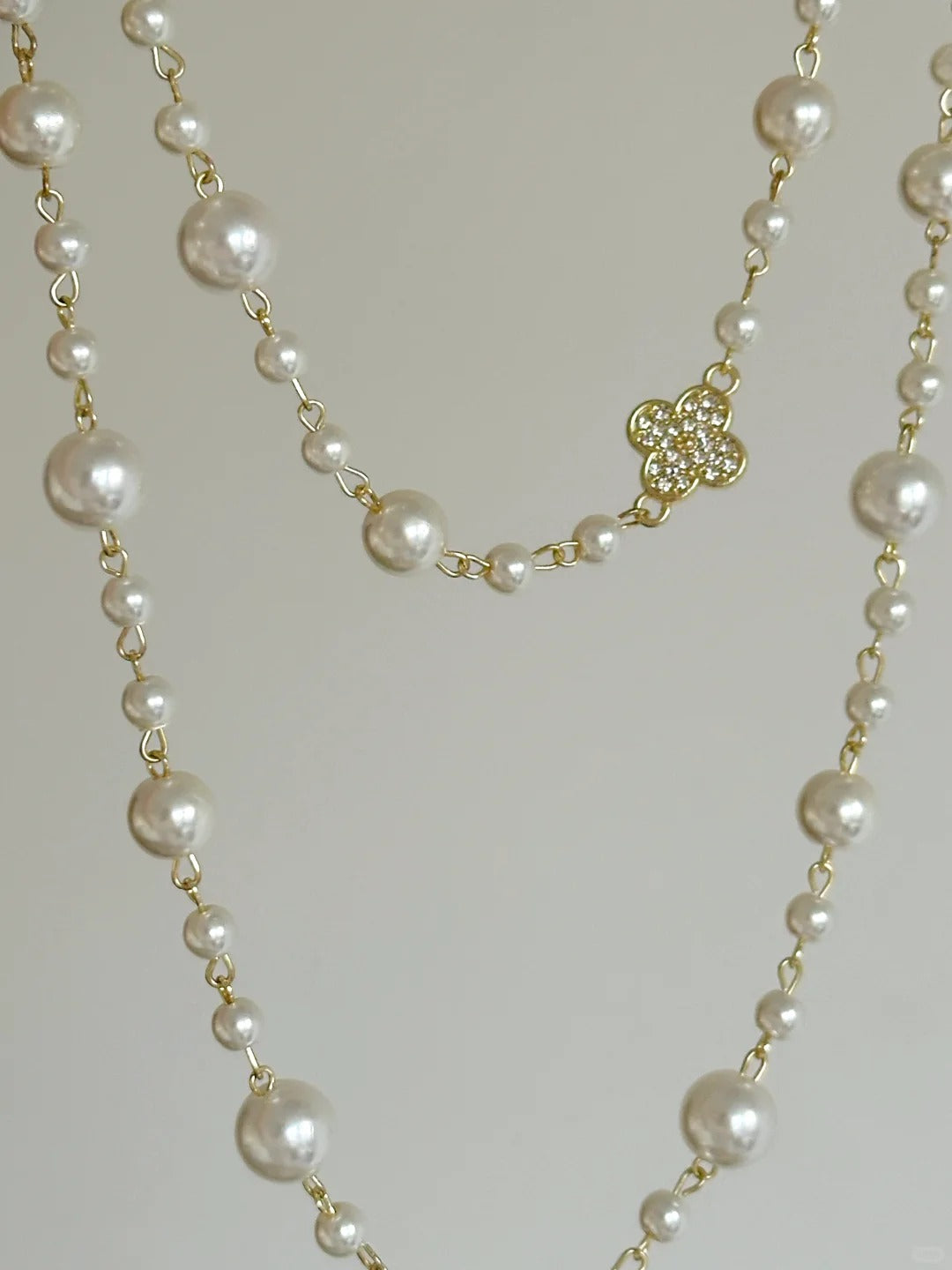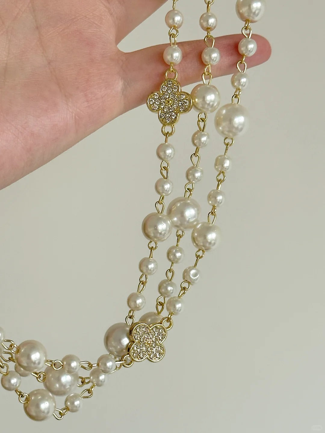 Add a touch of vintage glamour with this clover pearl layered necklace, featuring a design that can be worn in two or three layers for different elegant looks.