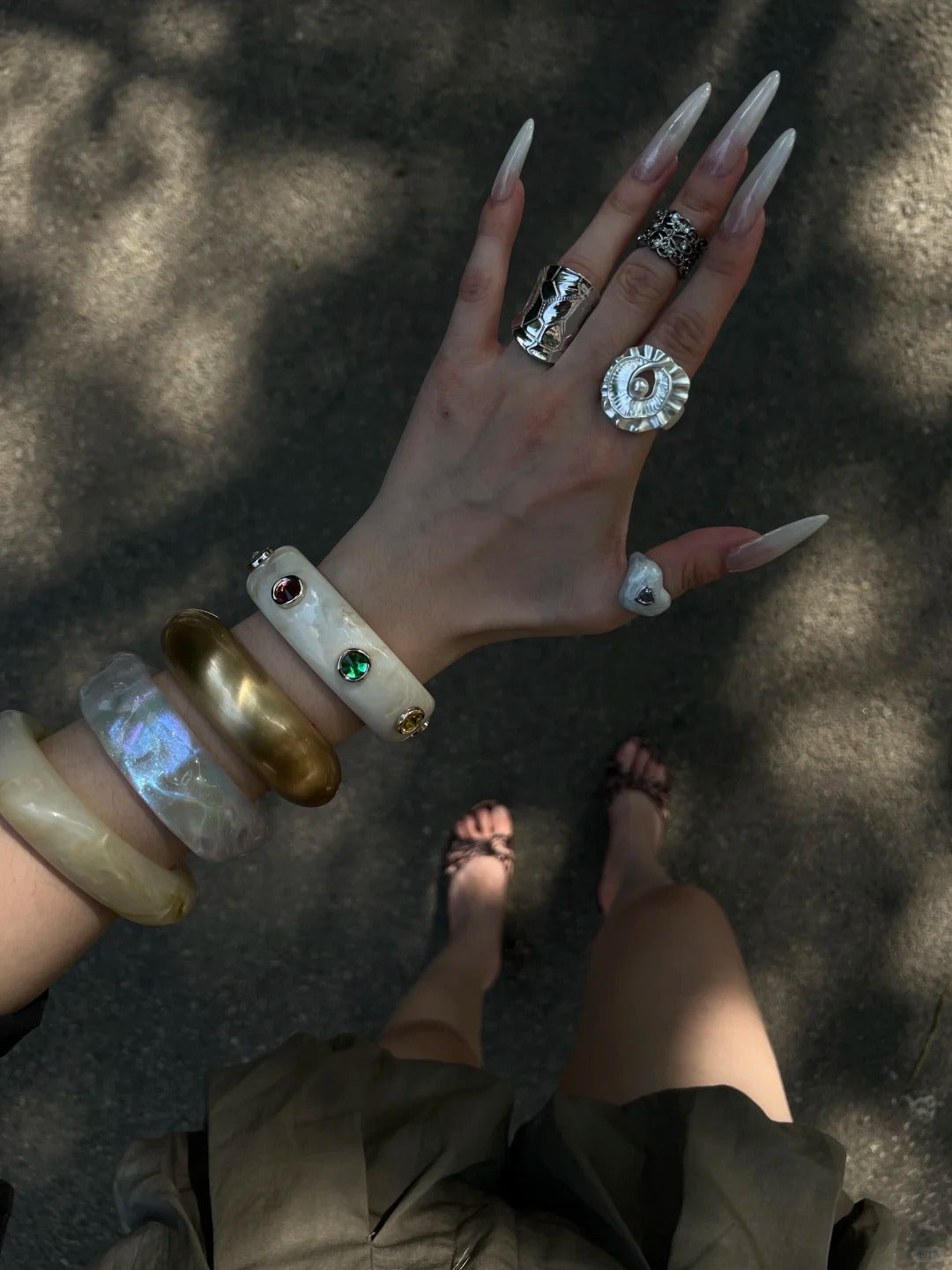 Add refined shine to your look with this Matte Shimmer Wide Bangle in gold and silver tones. Designed with a minimalist yet bold finish, this bangle offers the perfect balance between subtle sparkle and modern edge. Ideal for stacking with metal bangles, ball rings, or minimalist jewelry, it’s a versatile and affordable luxury accessory that enhances both casual and elegant outfits.