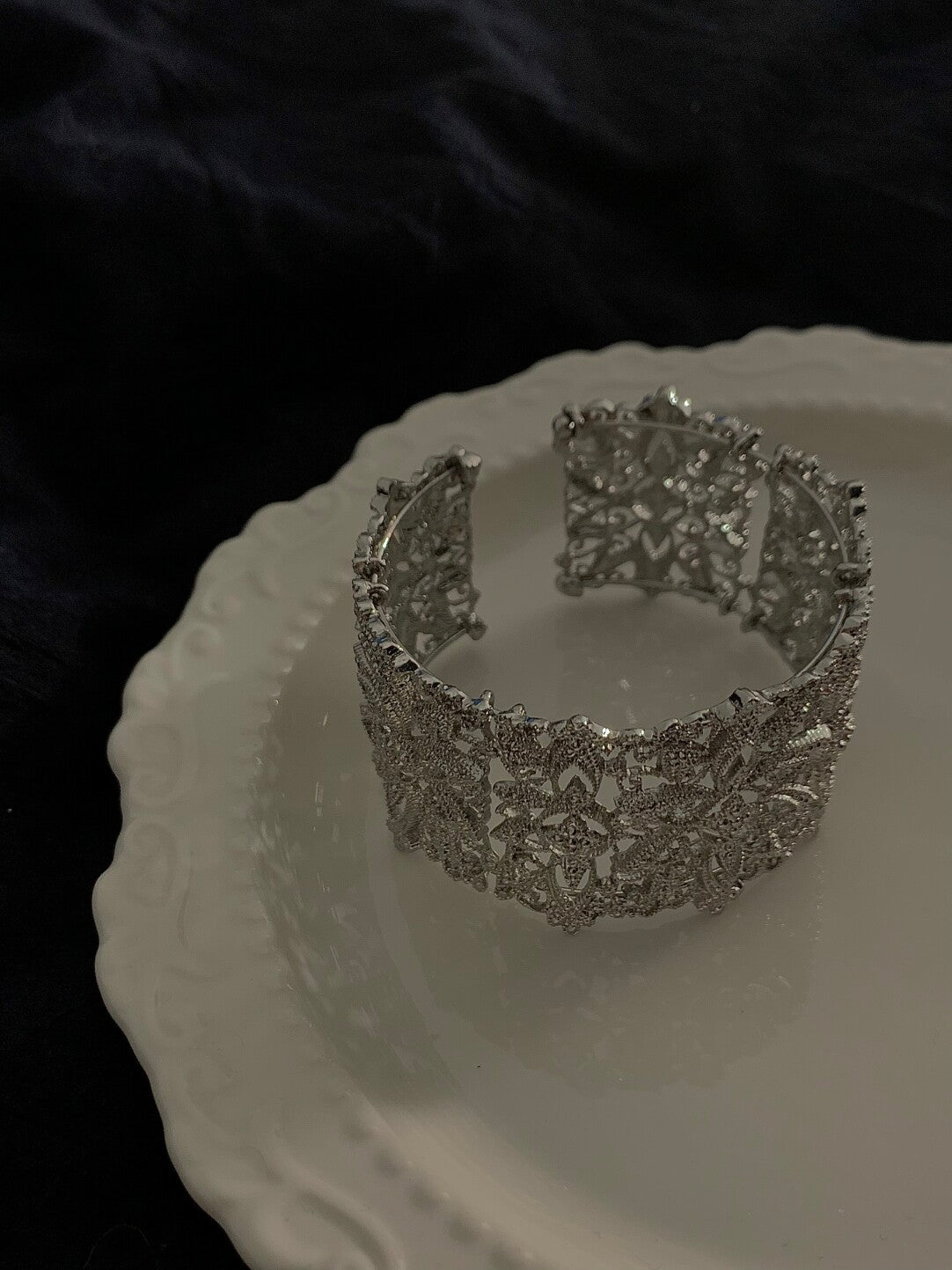 • Hollow carved wide cuff bangle in gold and silver