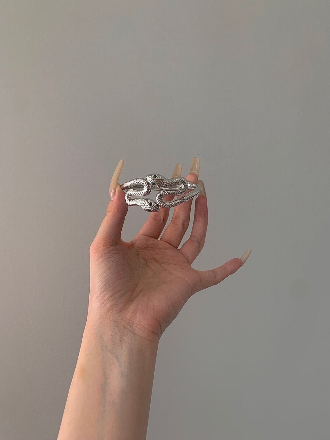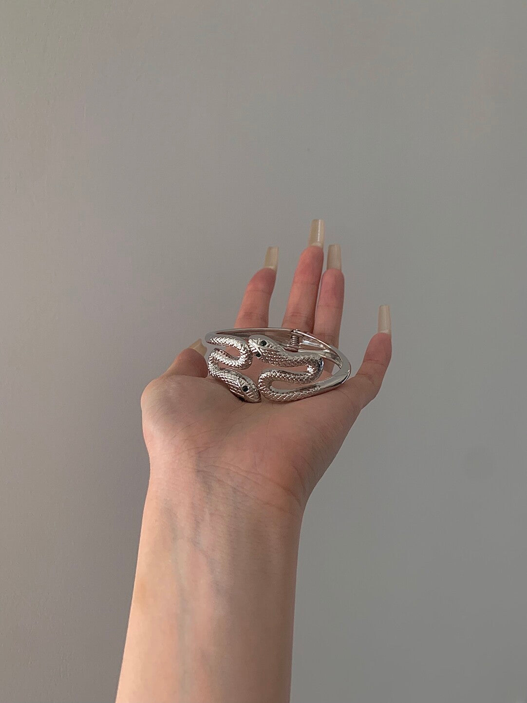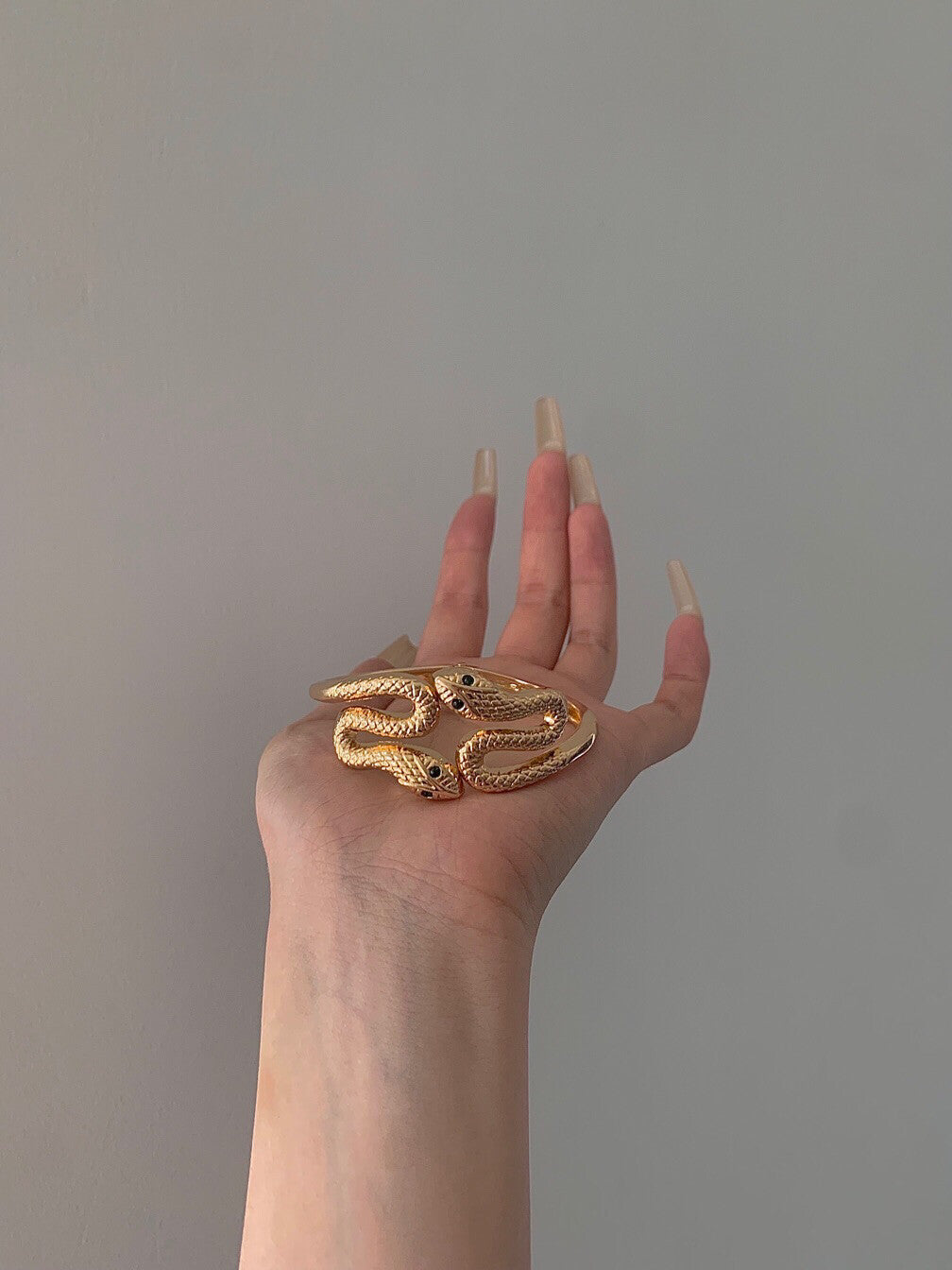 Add a bold and elegant touch to your look with this Double Serpent Bracelet. Available in gold and silver, this finely crafted bracelet features intertwining serpents, making it perfect for stacking or wearing solo. Its shimmering design adds a luxurious yet trendy accent, ideal for elevating everyday outfits or completing a statement look.