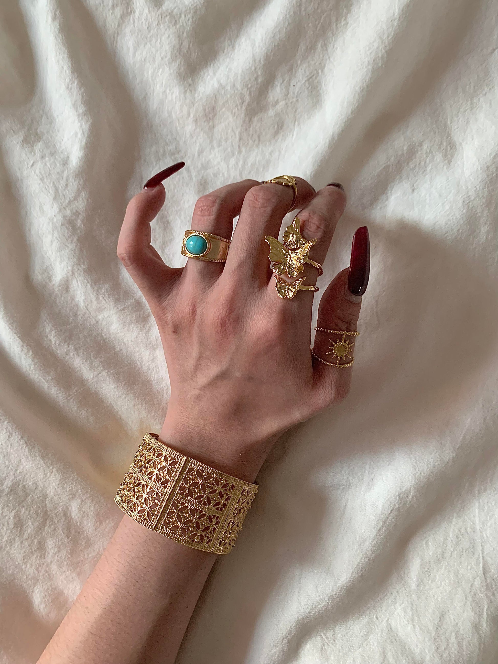 • Wide metal cuff with lace-inspired design and shimmer finish