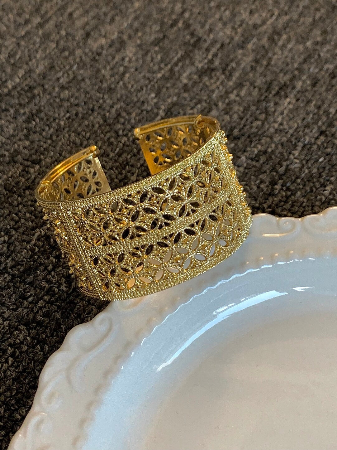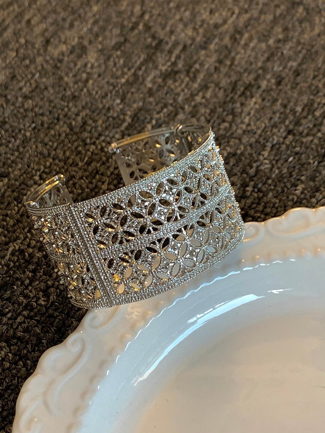 $9.9 each – Shimmer Lace Wide Metal Cuff. Buy 2 with free shipping for a trendy, affordable statement accessory.