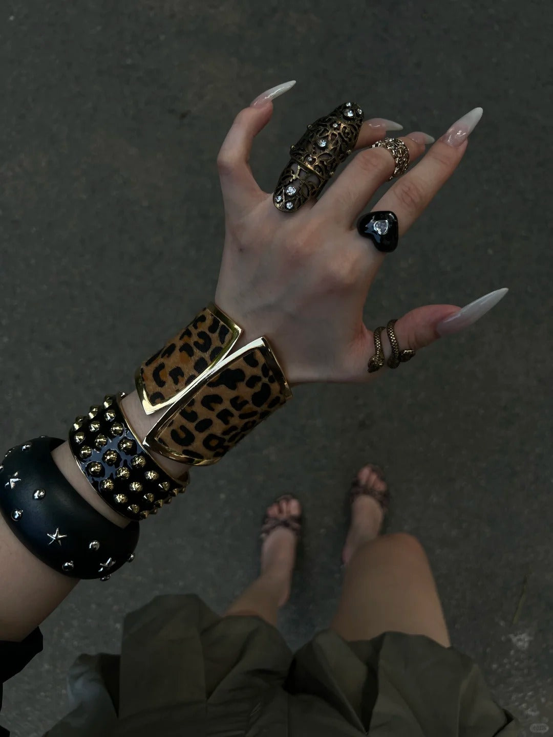 Add an edgy punk accent to your outfit with this Metal Studded Wide Wooden Bangle. Featuring bold metal studs on a wide wooden cuff, it’s perfect for streetwear, layering with other bangles, or wearing solo for a standout look. Affordable, stylish, and statement-making, this bangle brings a punk attitude to any ensemble.