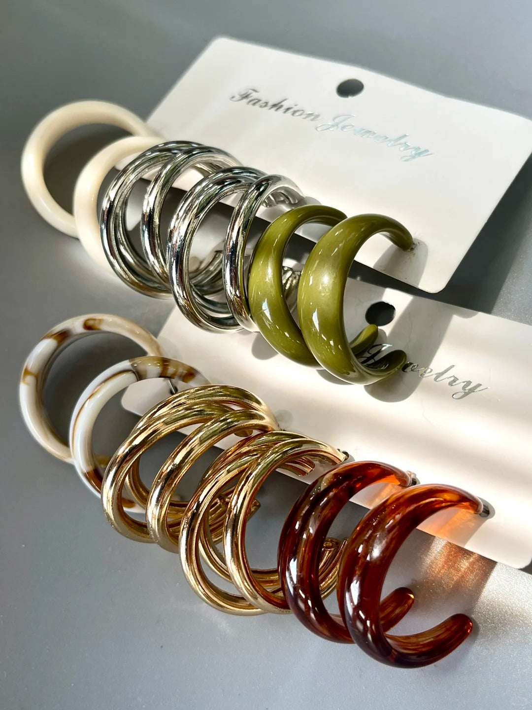 • 6 pairs of acrylic hoop earrings in various bold colors